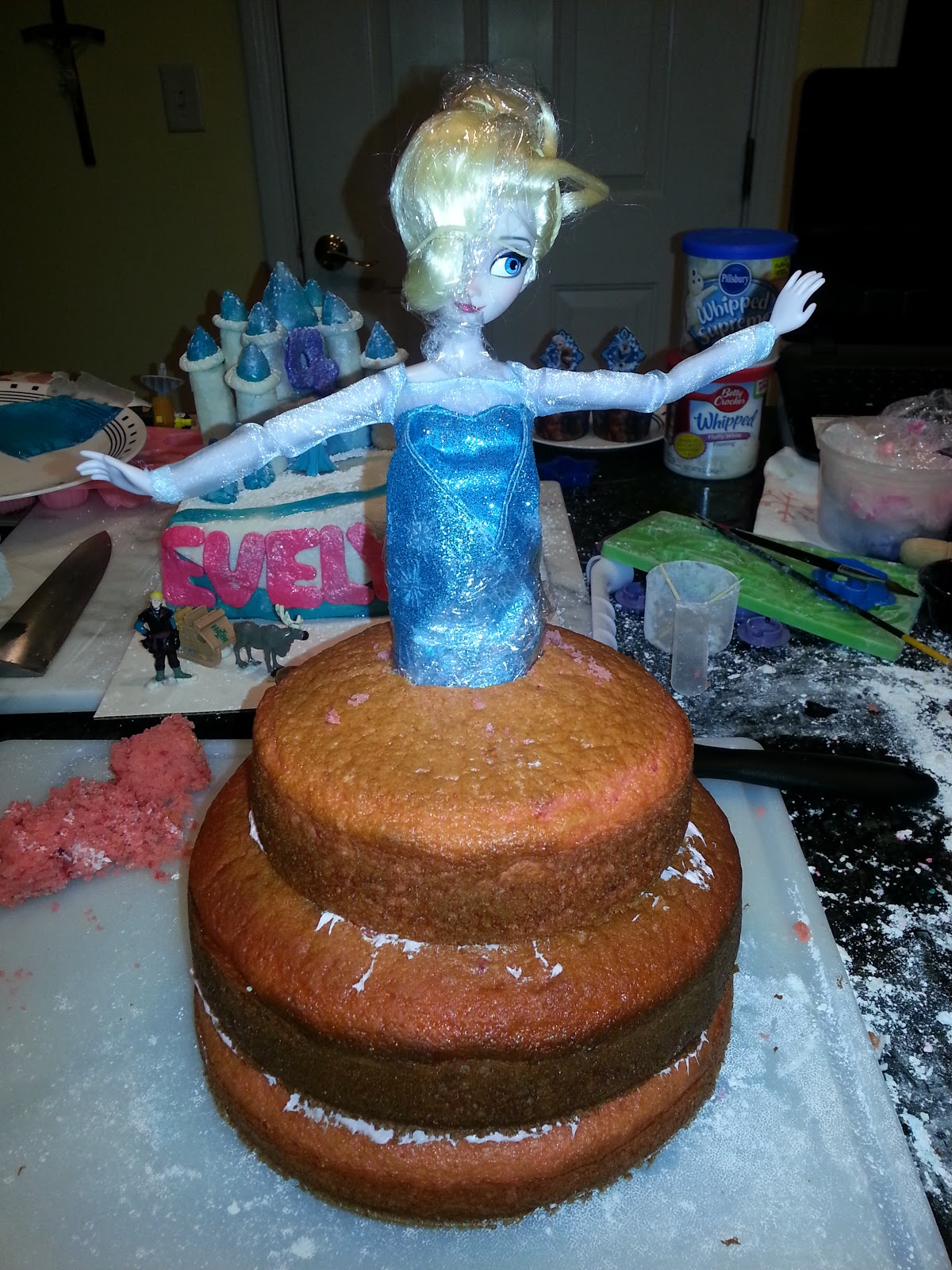 Before I frosted the cake with vanilla frosting and added the fondant, I did remove Elsa. Now she's back in and looking fabulous.